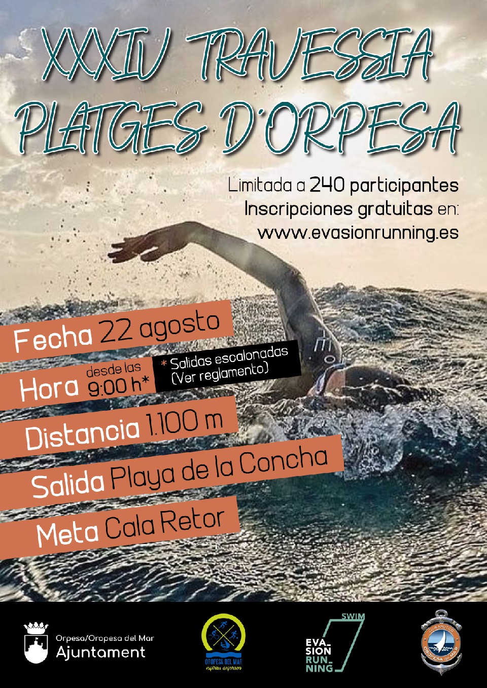 El Exc. Ayuntamiento de Oropesa del Mar organiza XXXIV TRAVESIA PLATGES DE OROPESA, prueba que se celebrará el sábado 22 de agosto a partir de las 9:00 h desde la playa de la Concha y finalizará en la zona del puerto deportivo (cala Retor) con una distancia de 1150 m. Cumpliendo la normativa Autonómica se efectuarán salidas a partir de las 9:00 h. de manera escalonadas cada 10’ según la siguiente tabla: