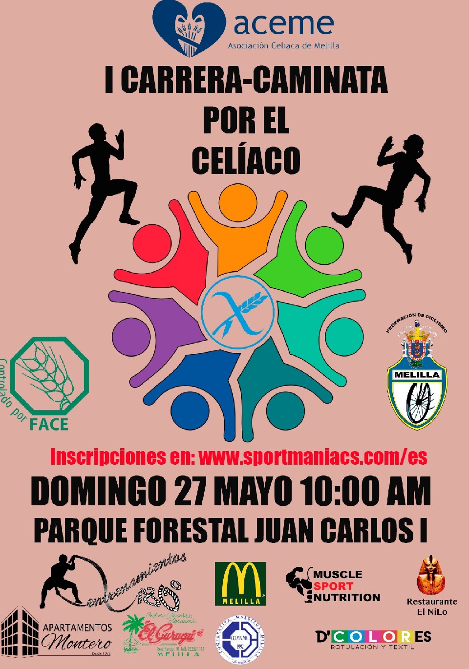 La Asociación Celíaca de Melilla, perteneciente a la Federación de Asociaciones de Celiacos de España (FACE), organiza la I Carrera-Caminata por los Celíacos en Melilla, el domingo 27 de mayo de 2018, a las 10:00 horas, en el en el Parque Forestal de la Granja Agrícola Juan Carlos I., con el objetivo de concienciar e informar a los ciudadanos sobre la enfermedad y sus consecuencias.