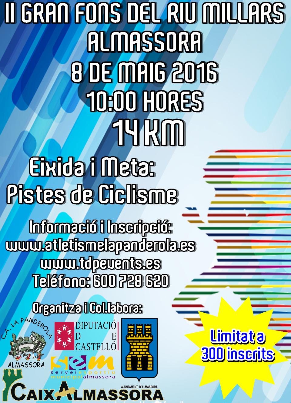 Organitza el Club d' Atletisme La Panderola amb el suport de l' Ajuntament d' Almassora , la Diputació de Castelló , Caixa Almassora i el SEM.