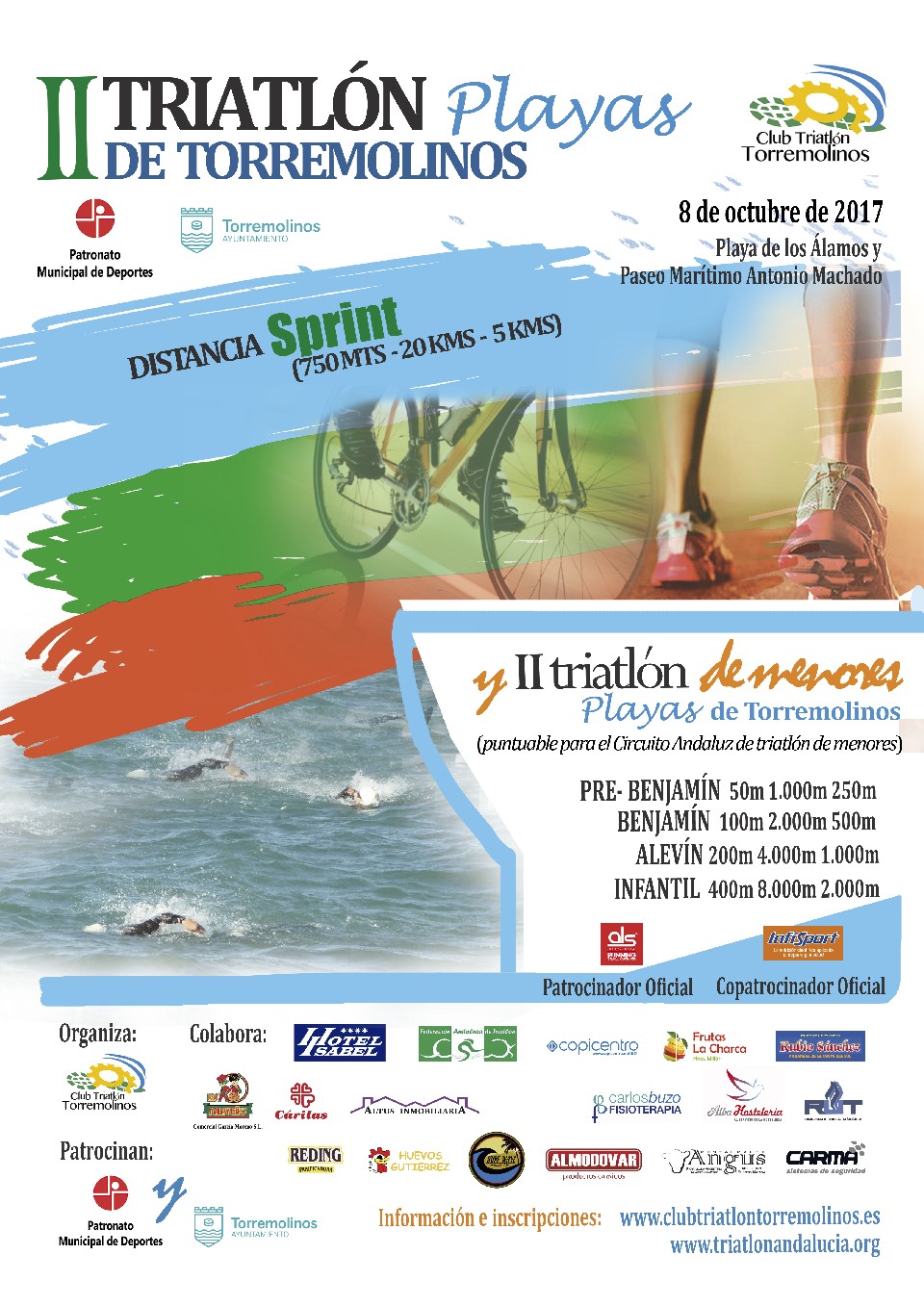 Wyniki INFANTILES 08/10/2017 12:00 14km Zobacz wyniki ALEVINES 08/10/2017 12:00 7km Zobacz wyniki BENJAMINES 08/10/2017 12:00 3.5km Zobacz wyniki PREBENJAMINES 08/10/2017 12:00 1.75km Zobacz wyniki FEDERADOS 08/10/2017 12:00 Oczekujące Wyniki NO FEDERADOS 08/10/2017 12:00 Oczekujące Wyniki Dane kontaktowe Kontakt z organizatorem – 639616571 Regulamin http://www.triatlonandalucia.org/competiciones/ii-triatl%C3%B3n-de-menores-playas-de-torremolinos