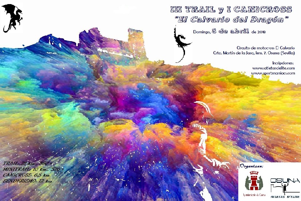 El III TRAIL “EL CALVARIO DEL DRAGÓN” se celebrará el domingo 8 de abril de 2018 a las 10:00 horas, pudiendo participar en la misma todas las personas mayores de 18 años que lo deseen, sin distinción de sexo o raza, siendo ésta organizada por el ILUSTRÍSIMO AYUNTAMIENTO DE OSUNA con la colaboración del C. A. ATLETAS D´ELITE DE OSUNA.