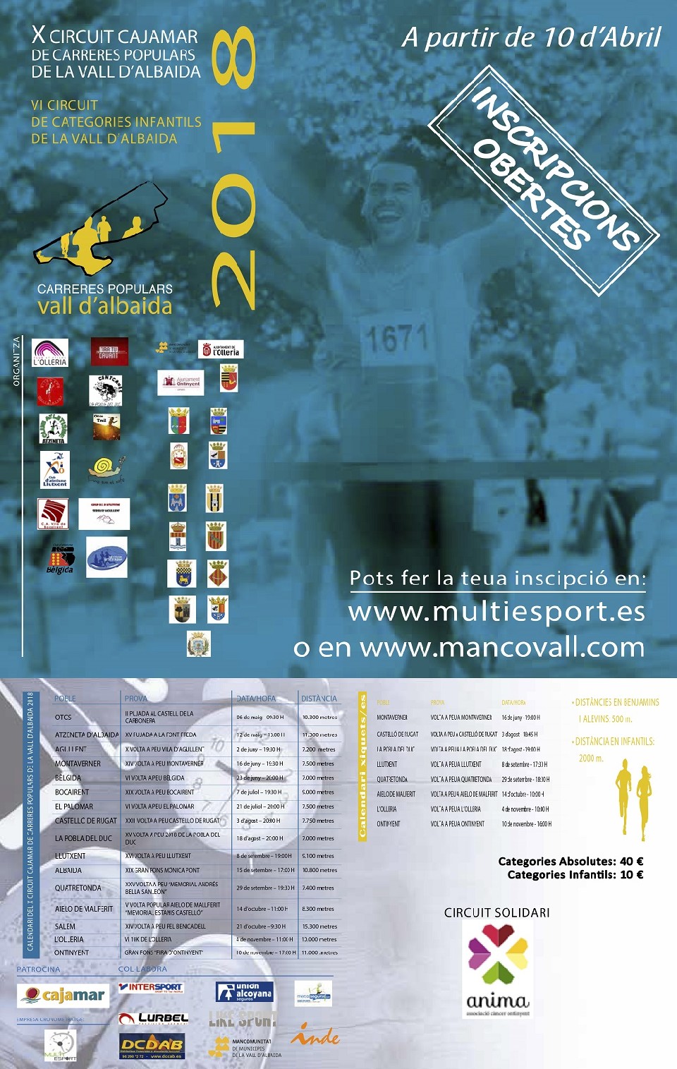 L’Associació de Clubs d’Atletisme Popular de la Vall d’Albaida organitza el X Circuit Cajamar de Carreres Populars de la Vall d’Albaida i el VI Circuit de Categories Infantils de la Vall d’Albaida 2018, al qual tindran accés totes les persones que ho desitgen. El circuit 2018 és, per tercera vegada, solidari amb la “Fundació ANIMA”; amb la qual cosa, de la quota d’inscripció al circuit i de la quota de carreres individuals que pague cada atleta, un euro anirà destinat a la seua Fundació. La finalitat d’aquesta entitat és ajudar als afectats de càncer des dels diferents àmbits que afecten, no sols al malalt, sinó també al seu entorn (familiars, amics, etc.).