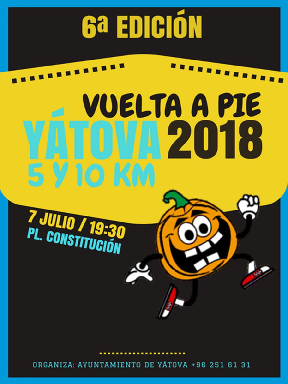 El grupo de corredores de Yátova junto con la colaboración del Ayuntamiento de Yátova, Concejalía de Deportes, organizan la 6ª edición de la Vuelta a Pie Yátova, que se celebrará el sábado 7 de Julio de 2018, prueba a la cual tendrá acceso cualquier persona sin distinción de sexo, raza o nacionalidad, que sea mayor de 14 años, o menos con consentimiento de sus padres o tutores legales.