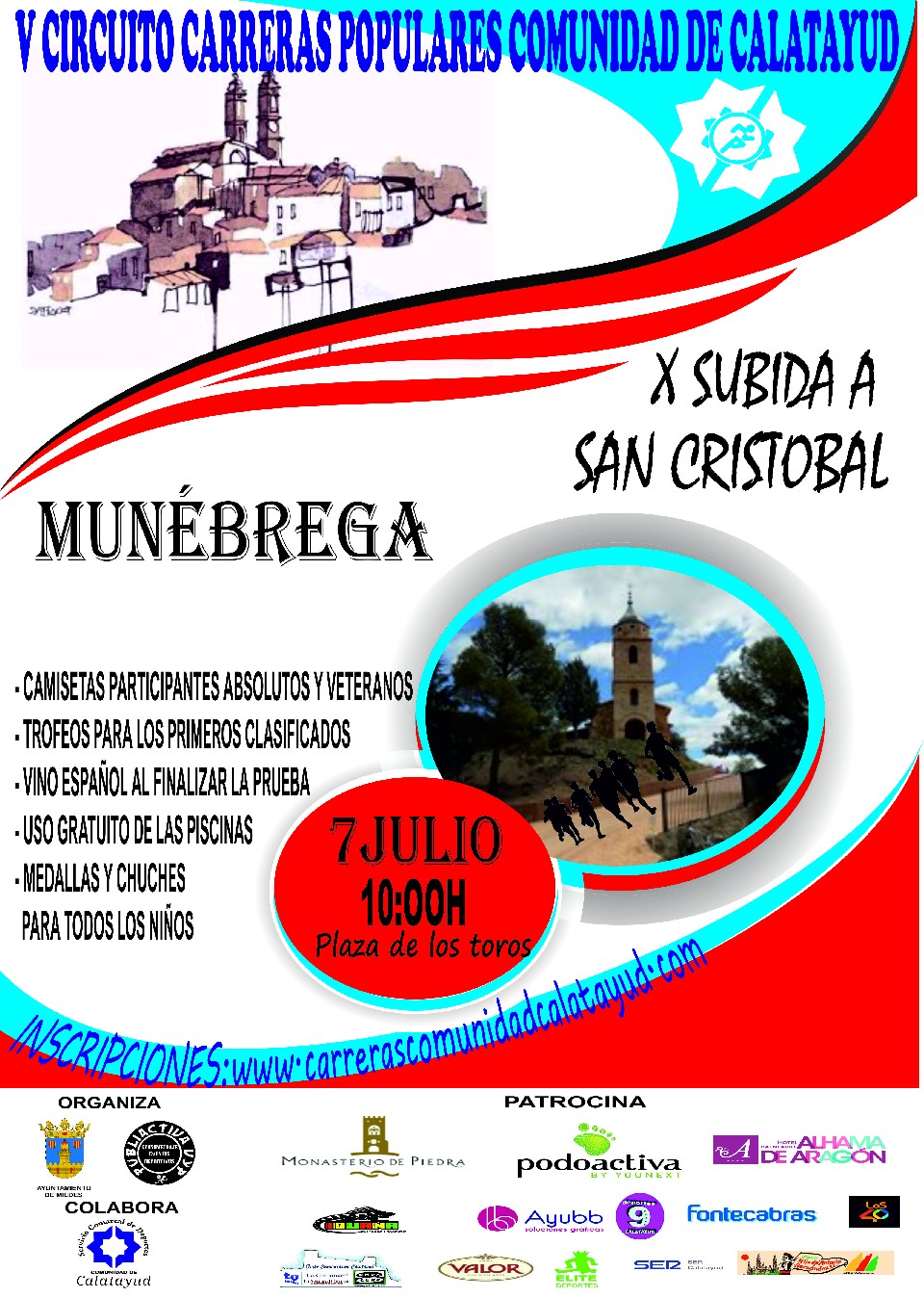 • El próximo día 07 de julio de 2018, con motivo de la festividad de San Cristóbal en la localidad de Munébrega (Zaragoza), el Excmo. Ayuntamiento de Munebrega, Publiactivavyp y el Club de Atletismo Calatayud organizan la “X Subida a San Cristóbal”.