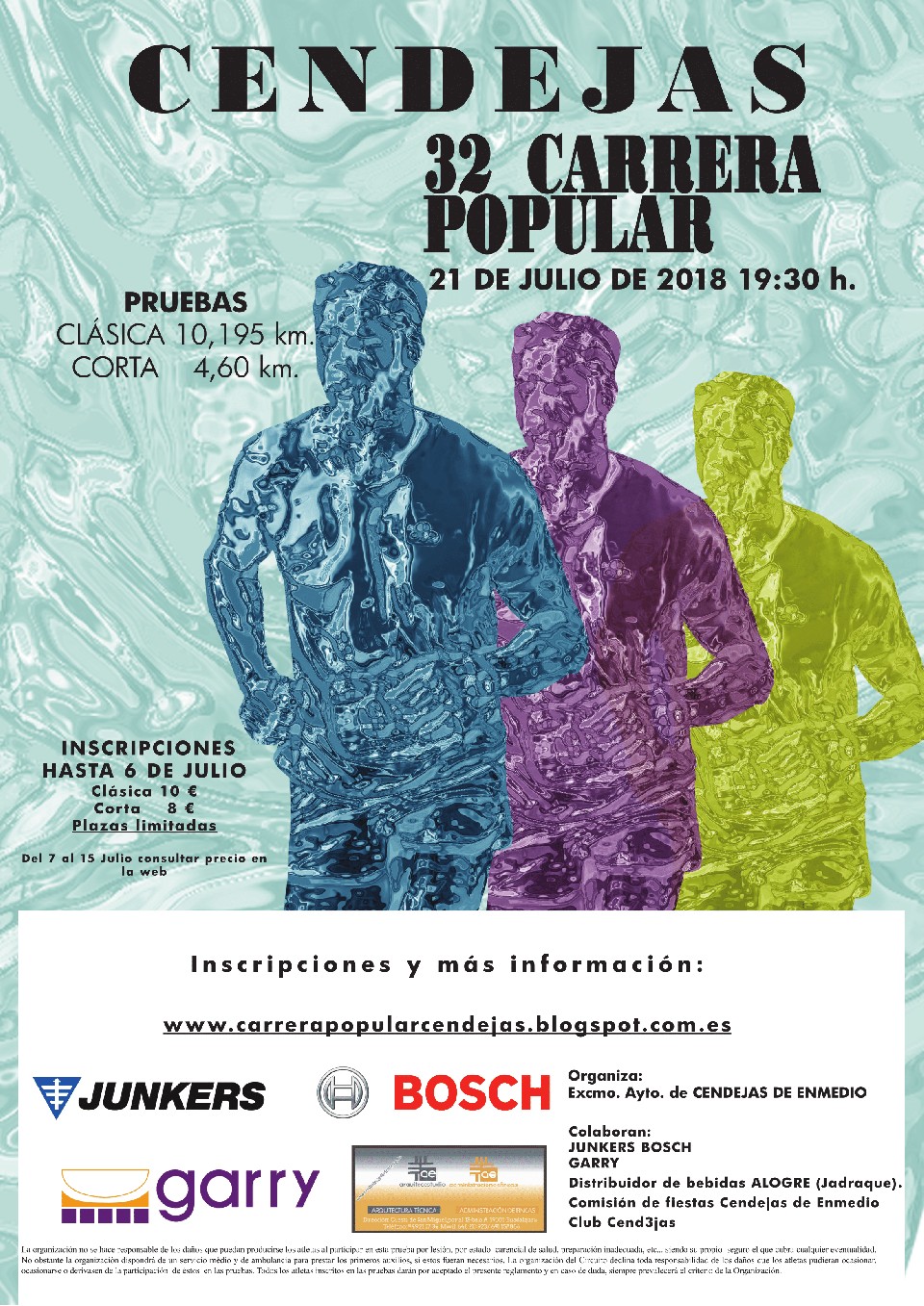 El Ayuntamiento de Cendejas de Enmedio, con la colaboración de la comisión de fiestas y la asociación cultural "El Pico Verde", organiza el sábado día 21 de Julio de 2018 a las 19:30 horas la XXXII edición de la carrera popular "CENDEJAS".