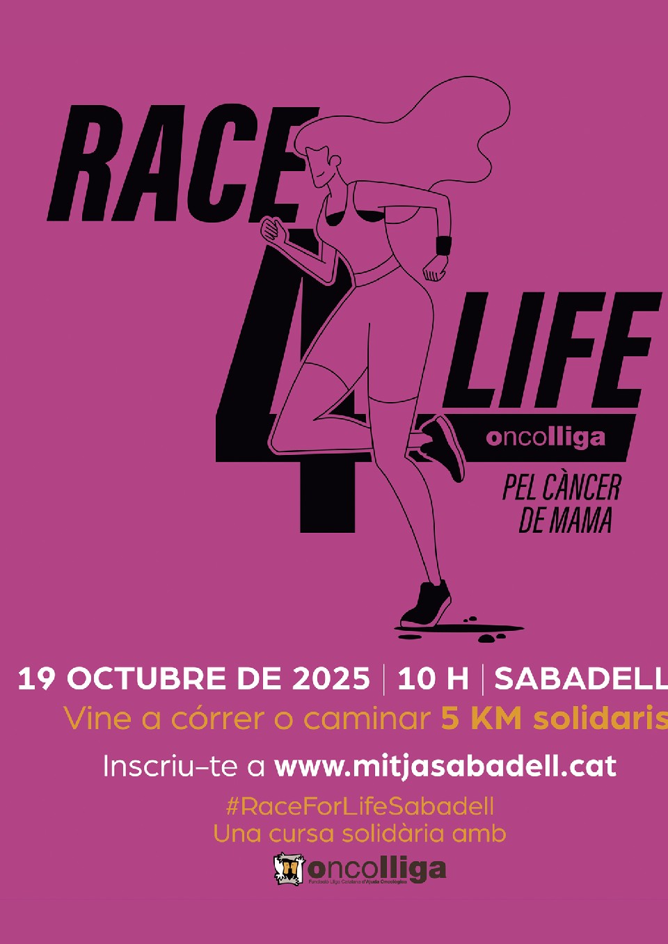 1.- La Fundació ONCOLLIGA, amb la col·laboració de l'Associació Esportiva Mitja Marató Sabadell i de l'Ajuntament de Sabadell, organitza la RACE FOR LIFE pel CÀNCER DE MAMA. Una cursa solidària els beneficis de la qual van destinats a la Fundació ONCOLLIGA.