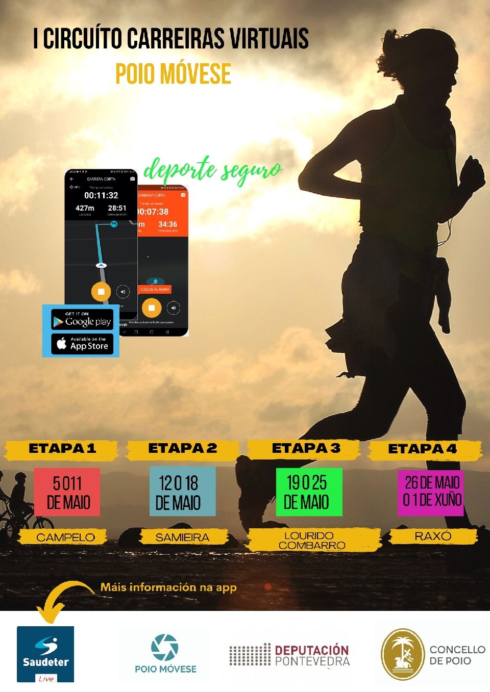 Para poder participar nas carreiras é preciso instalarse no teléfono móbil a aplicación “Saudeter” dispoñible tanto en Play Store coma en App Store.