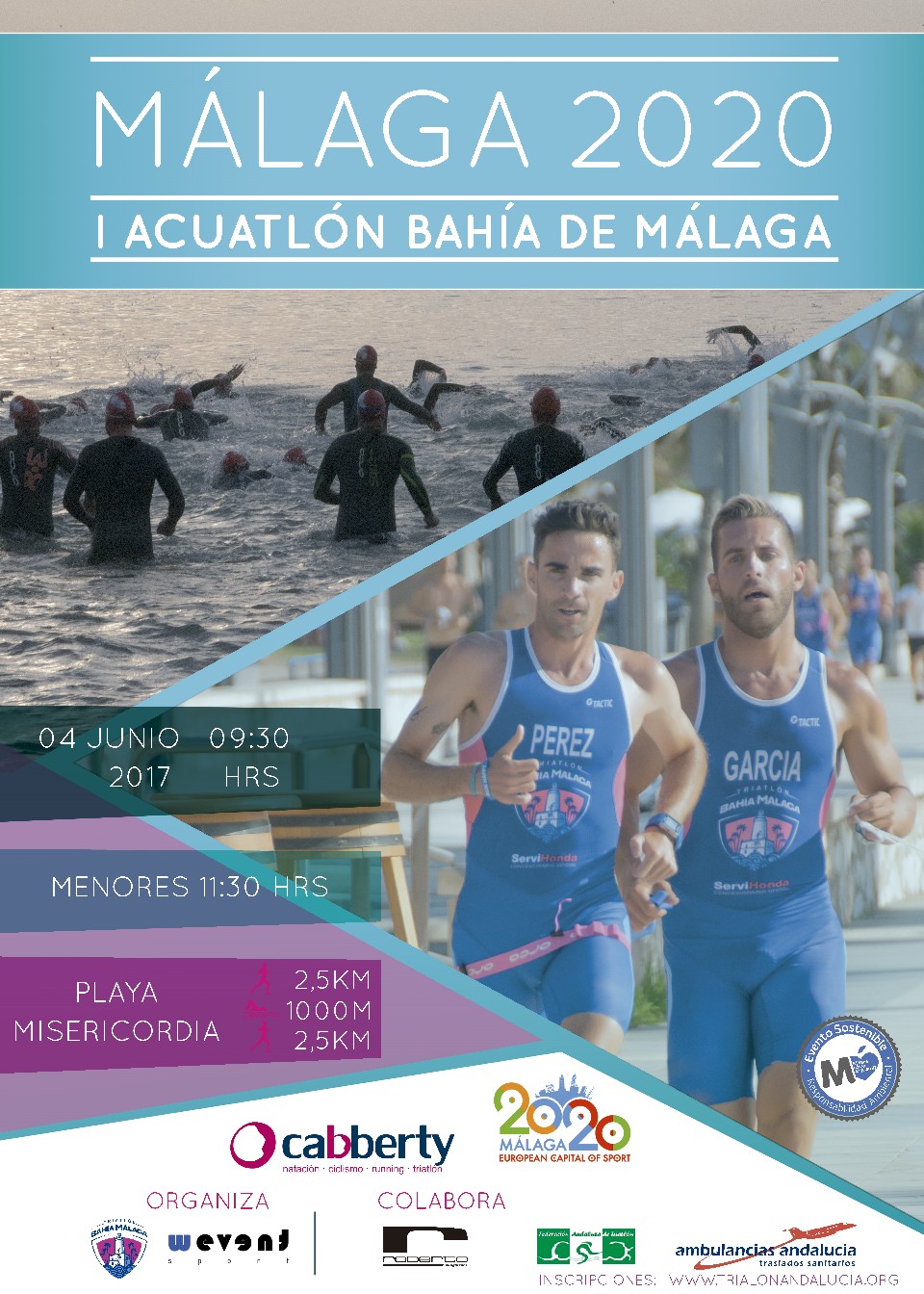 El I Acuatlón Bahía de Málaga – Málaga 2020 se celebrará el domingo 4 de Junio de 2017 a las 09:30 horas, con salida y llegada en zona próxima al Paseo Marítimo de la Playa de la Misericordia (Málaga).