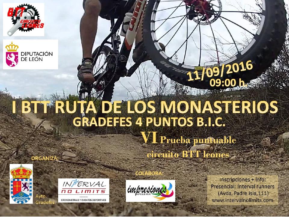 La “I BTT RUTA DE LOS MONASTERIOS” es la 6ª de las 8 pruebas puntuables para el “I Circuito Leonés BTT” y tendrá lugar el próximo 11 de septiembre de 2016 en gradefes a partir de las 09:00h con salida y meta en dicha localidad . Constará de un único recorrido circular de 50 kilómetros