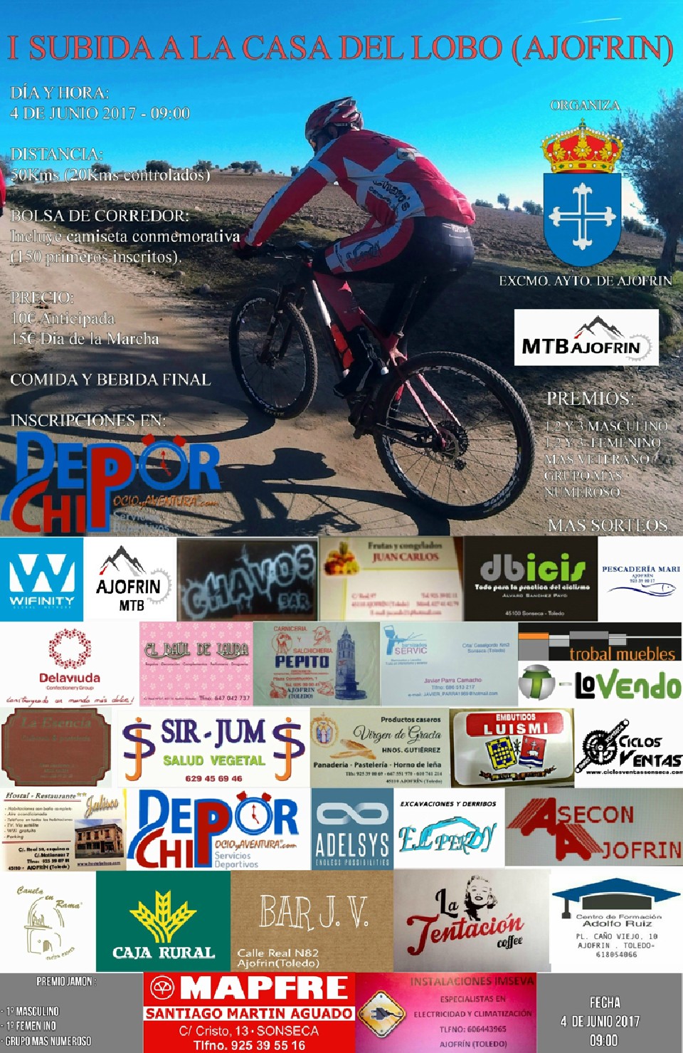 - Derechos de imagen. La aceptación del reglamento implica la autorización a la organización, a la publicación y grabación parcial o total, dando su consentimiento para utilizar su nombre e imágenes en cualquier modalidad, para la promoción de la actividad deportiva por el Ayuntamiento de Ajofrín. Rechazando derechos a recibir compensación económica. Todos los ciclistas, por el hecho de participar, deberán aceptar el presente reglamento.