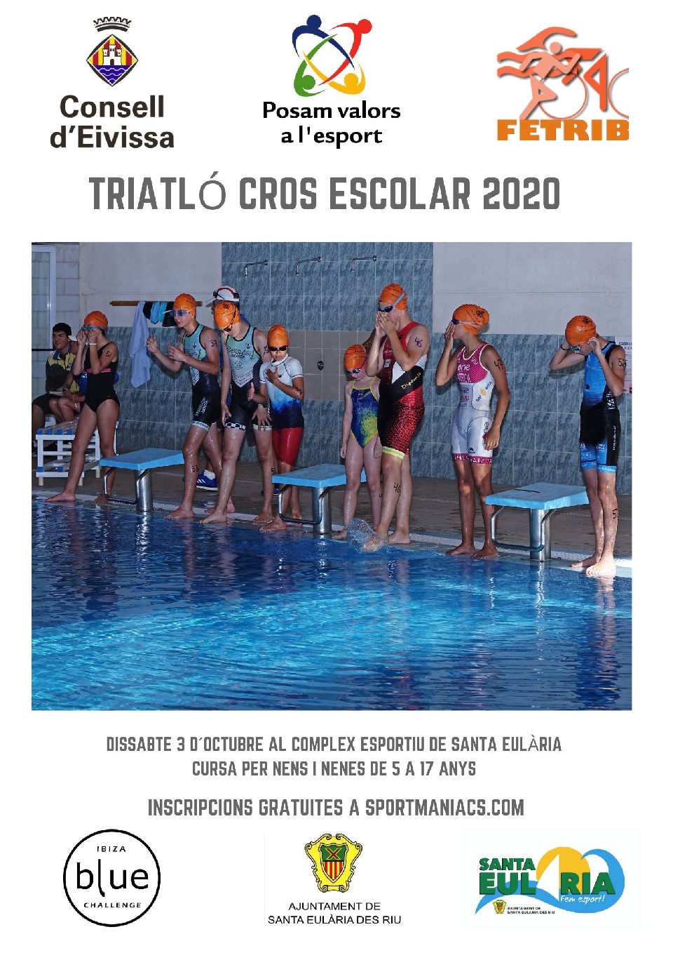 1. El TRIATLÓ CROS ESCOLAR 2020 es una prueba organizada por la Federación Balear de Triatlón e Ibiza Blue Challenge, patrocinada por el Consell Insular de Ibiza y con la colaboración del Ayuntamiento de Santa Eulària. La prueba se celebra en las instalaciones municipales deportivas de Santa Eulària des Riu y terrenos anexos.