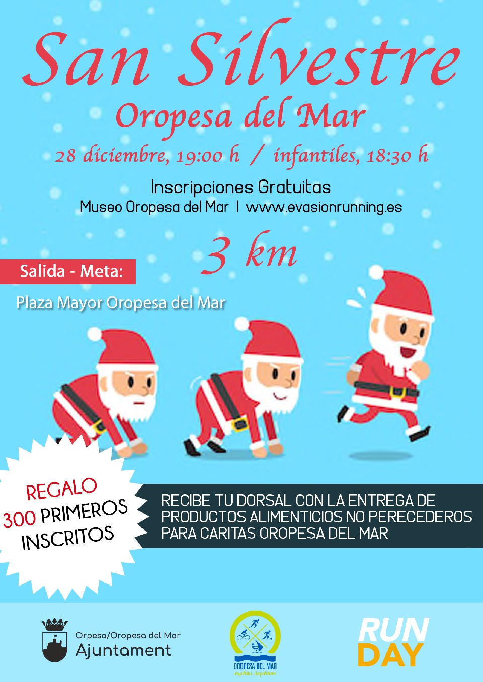 El Excelentísimo Ayuntamiento de Oropesa del Mar, organiza con la colaboración de Run Day, la SAN SILVESTRE, prueba atlética en la que podrán participar todas las personas que lo deseen, debidamente inscritas.
