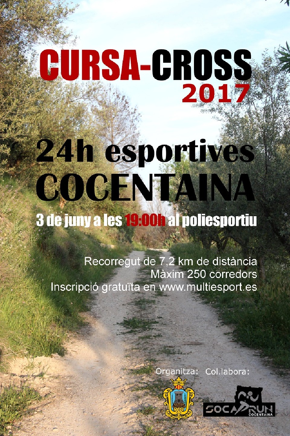 La "V CURSA - CROSS 24 HORES ESPORTIVES" se celebrará el próximo sábado 3 de junio de 2017 a las 19:00h, en el polideportivo municipal de Cocentaina. En esta carrera podrá participar cualquier persona sin distinción de sexo o nacionalidad mayor de 16 años.