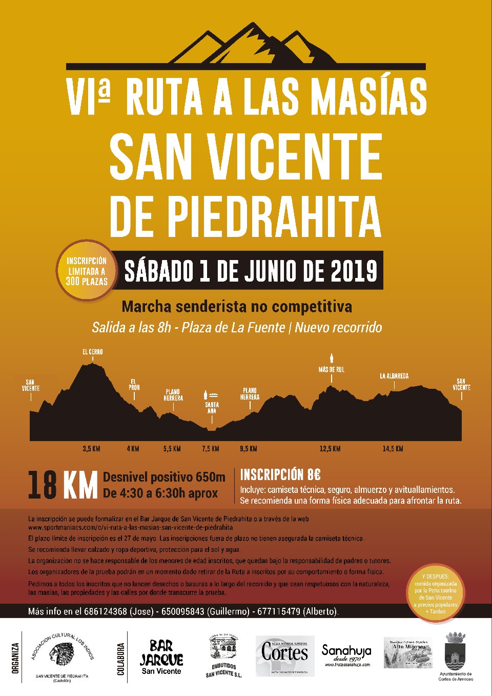 La VI Ruta a las Masías de San Vicente se celebrará el 1 de junio de 2019. La salida tendrá lugar a las 8 horas desde la Plaza de la Fuente.