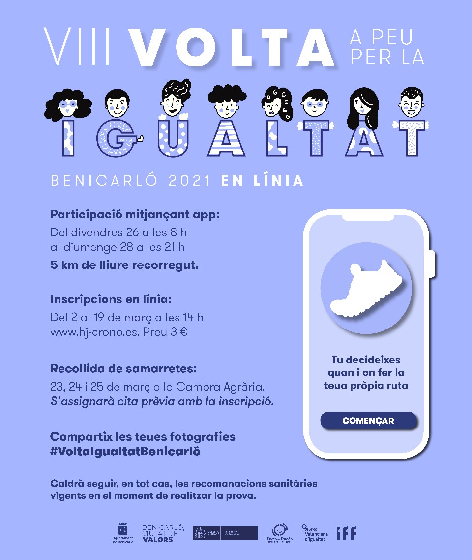 Article 1. Descripció La Regidoria de Serveis Socials i Polítiques Inclusives de l’Ajuntament de Benicarló, amb la col·laboració d’H&J FITNESS, organitzen la VIII Volta a Peu per la Igualtat. Enguany a causa de la crisi sanitària de la COVID19, l'esdeveniment tindrà un format en línia. La prova tindrà lloc mitjançant una aplicació instal·lada al dispositiu mòbil de cada persona participant, amb un recorregut no definit de 5000 m. Les persones participants podran fer la caminada des del divendres 26 de març a les 8:00 h fins al diumenge 28 de març a les 21:00 h.