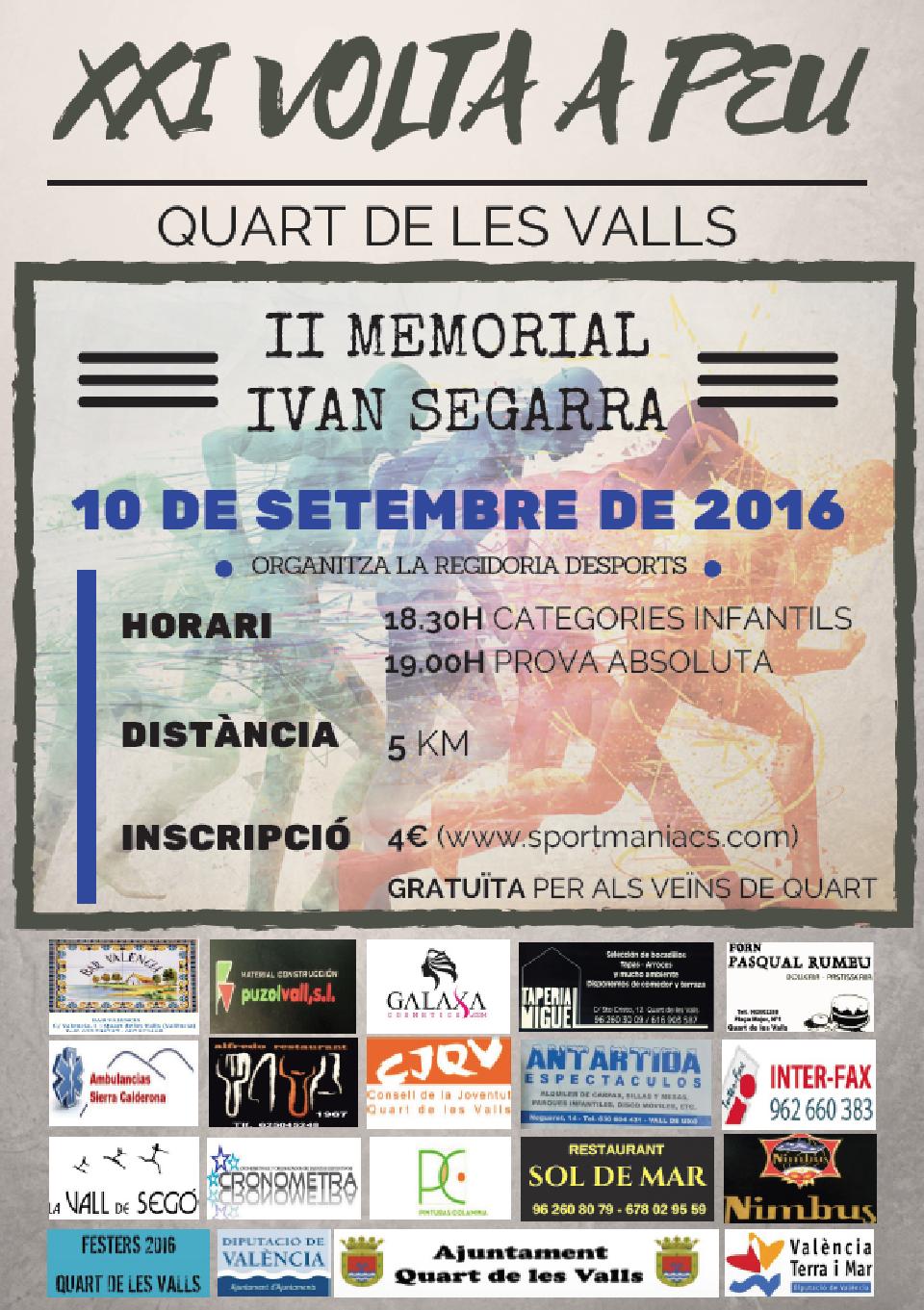 Art. 1) La Regidoría d’Esports de l’Ajuntament de Quart de les Valls organitza la XXI Volta a Peu a Quart de les Valls II Memorial Iván Segarra amb la col·laboració de l’Ajuntament de Quart de les Valls, del C.A. La Vall de Segó i altres organismes i firmes de la Comarca.