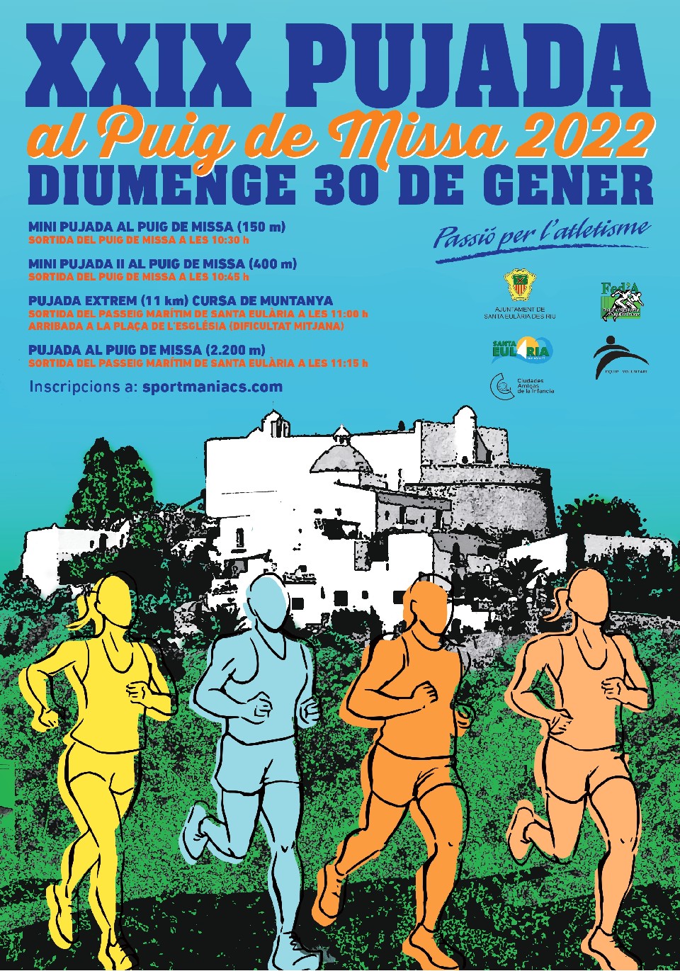 El Ayuntamiento de Santa Eulària organiza la clásica XXIX PUJADA AL PUIG DE MISSA 2022, carrera sobre asfalto de 2,2 km a la que tendrán acceso todas las personas a partir de categoría infantil, con o sin licencia federativa. La prueba se disputará el domingo 30 de enero de 2022 y tendrá su salida a las 11:15h en el paseo marítimo de Santa Eulalia con llegada a la plaza del Puig de Missa.