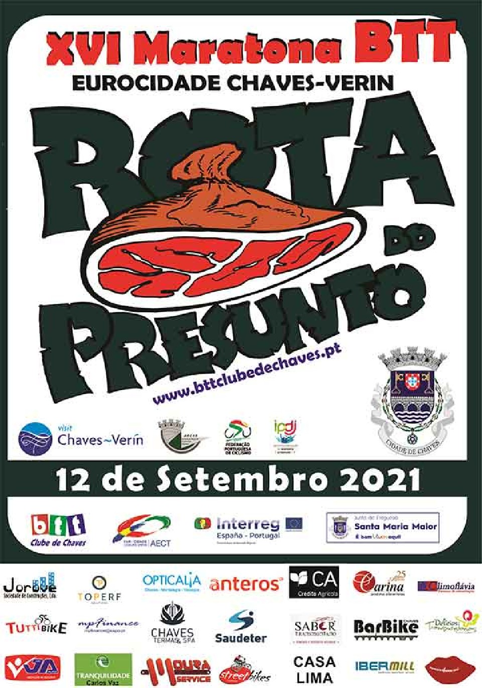 1. A organização da prova está a cargo de BTT Clube de Chaves e denomina-se “XV Maratona BTT Rota do Presunto” e terá lugar em Chaves no dia 12 de Setembro de 2021, com partida agendada para as 9h30. O secretariado terá lugar no Centro Cultural de Chaves e funcionará nos seguintes horários: 12 de Setembro; 7h00/9h00. A partida e a chegada serão no Centro Cultural de Chaves