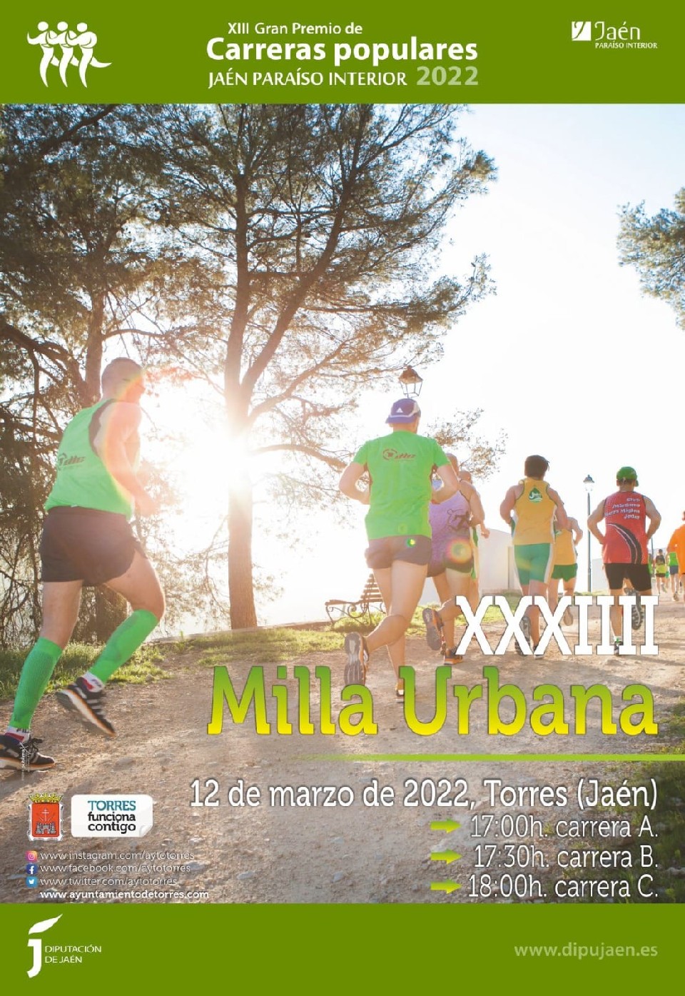 Además, entrado en www.dipujaen.es puedes descargarte los servicios que te ofrecemos en esta prueba, como pueden ser la descarga de tu video y foto de llegada a la meta y tu diploma de participación en la “XXXIII Milla Urbana de Torres”.