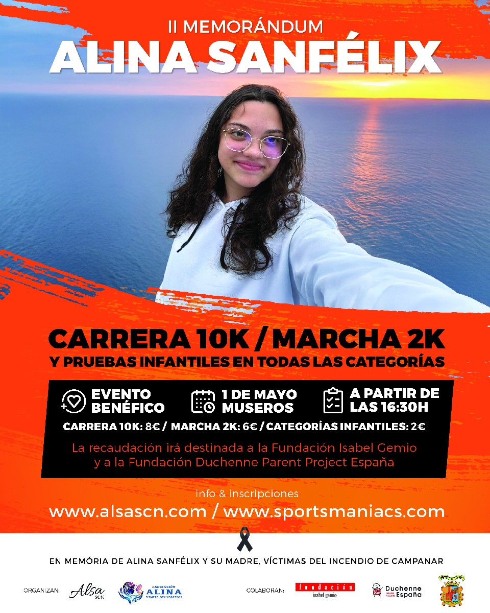 - La Empresa ALSA SCN S.L. y la Asociación ALINA SANFELIX organiza el 2º “MEMORÁNDUM ALINA SANFÉLIX” que tendrá lugar el VIERNES día 1 de mayo de 2026 a las 16:30 horas la carrera de los QUERUBINES y las siguientes categorías correlativamente y una marcha de 2 km, que la previsión para hacer la última prueba que engloba 5 categorías se tiene prevista que su salida sea a las 19:00 desde la Calle Mayor, 100.